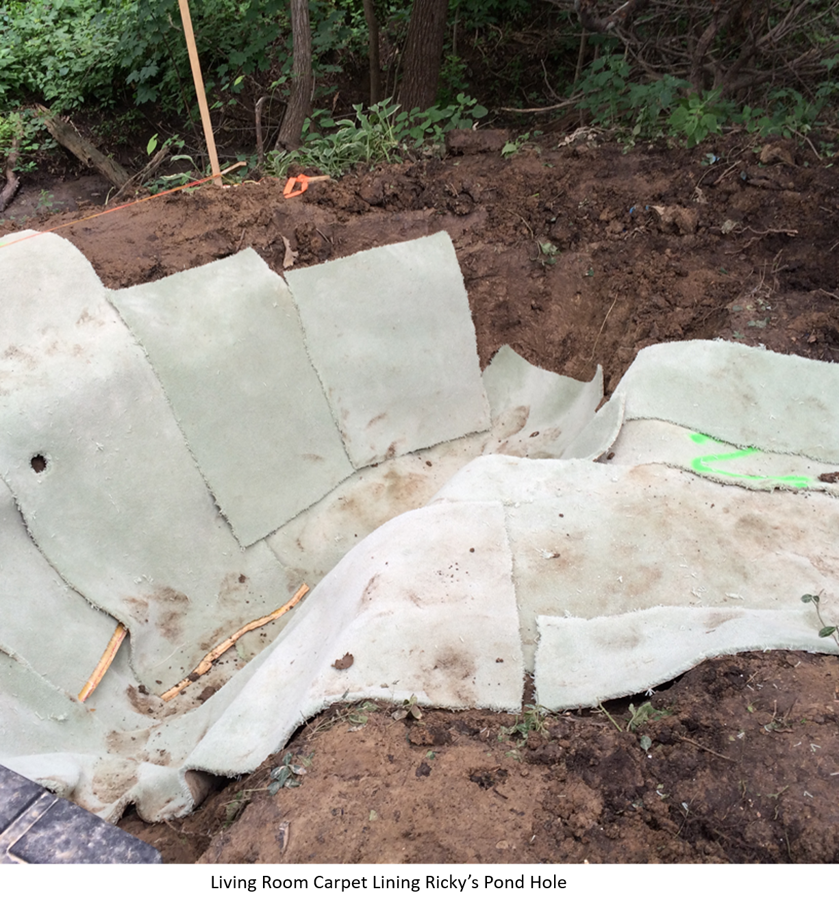 Now that the main pond was dug, I laid the carpet that I had saved from the living room into the pond hole to serve as a cushion for the liner. I had learned from my previous pond that roots can work their way into a liner, and once they find water they will destroy a pond quickly. The carpet would both cushion the liner and provide a barrier to roots. At this point I had dismantled the pond at home and moved the fish into Ricky’s 75-gallon aquarium where they waited for their new home.