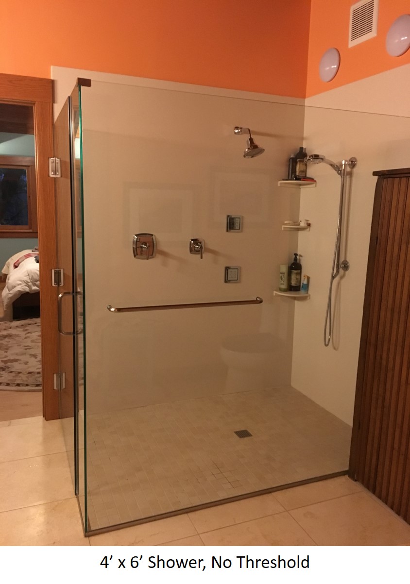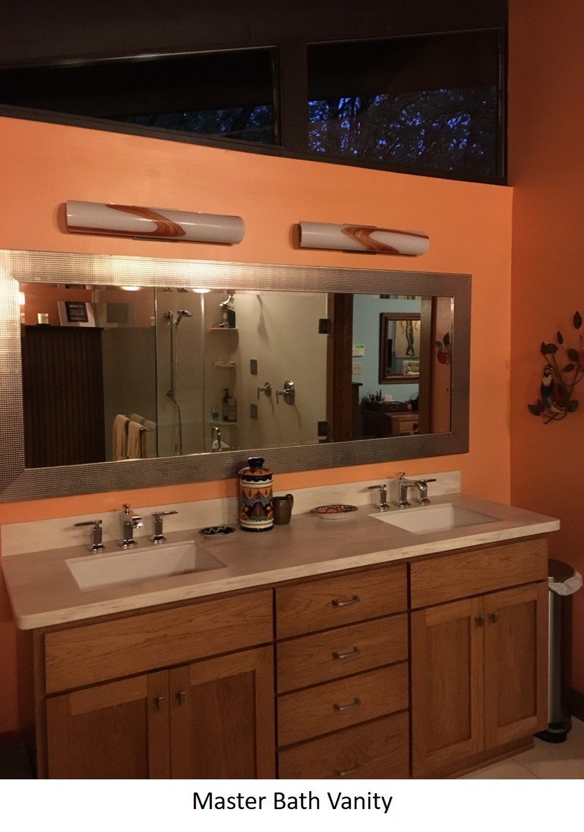 A few days after we returned home we received an email from Ericka with detailed plumbing plans and a shopping list that included item numbers and MSRPs– total cost for her work = $0. I took the list to Carl Ziesmer our friend and plumber, and he got some heart-stopping quotes from suppliers that he works with that exceeded MSRP. Although, as always, the labor estimate for his extensive work was quite reasonable. I then started Googling and found an online store with free delivery, no sales tax and costs of two-thirds to one-half of Ericka’s estimate. Although it rankled me to go online for a large purchase, this was a several thousand-dollar cost savings. We could afford the giant shower with wall jets – and a door! Here are some pics from the completed Master Bath.