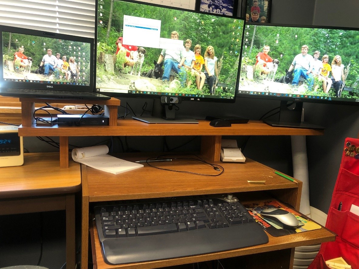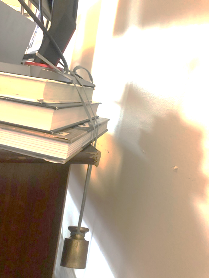 Rick (law student) - The engineers in this chat will either be proud or disappointed. My monitor wasn’t high enough so I used some textbooks as a stand. But the monitor is really front weighted and I was worry about it falling if i bumped it slightly. So to counter balance, I used a 1kg weight tied to a shoe string. It’s a lot more stable now.