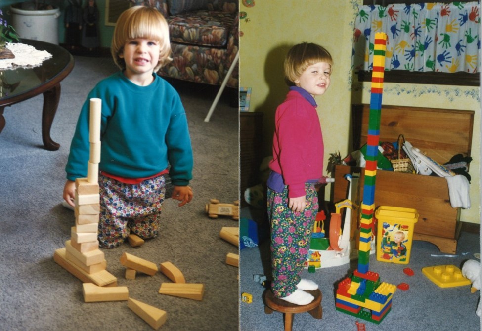 For oldest child Aileen, we go back a bit further for an example of her engineering prowess – how long does it take a child playing with blocks or Legos to realize that the foundation design is key to the height of the tower? I’m guessing these two photos are around age 2.