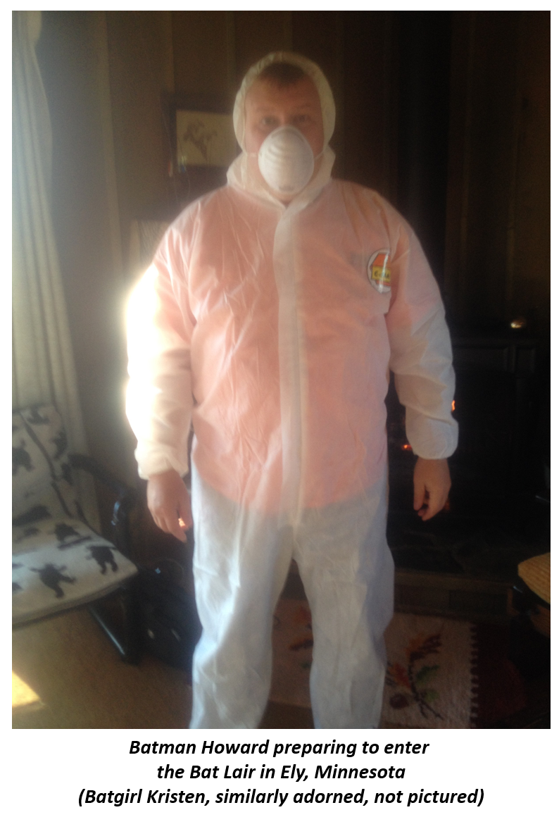 Mom and Dad would spend weeks at a time at the cabin, and their bedroom was downstairs. The adult kids (including Kristen and me at this point), and their (including our) kids, stayed in the upstairs bedrooms. When you first went upstairs after the cabin had been closed for a while, and especially on hot days, there was a strong odor which we would blame on dead mice, mildewy camping gear that was stored under the eaves, or simply closed-up cabin smell. It didn't bother Mom and Dad, because they stayed downstairs, but for us second floor dwellers it could be pretty gross. If we were up in the Spring(our most common time due to the combination of band and sports schedules), each night there would be constant activity in the A-Frame ceiling above our heads as bat families moved-in and out of the cabin in an endless parade of scratching, scrambling, and screeching. The Spring after I had met Buford the Joliet Batguy (see Installment #4) there was one night when Kristen and I could barely sleep due to the endless bat party! Something had to be done!