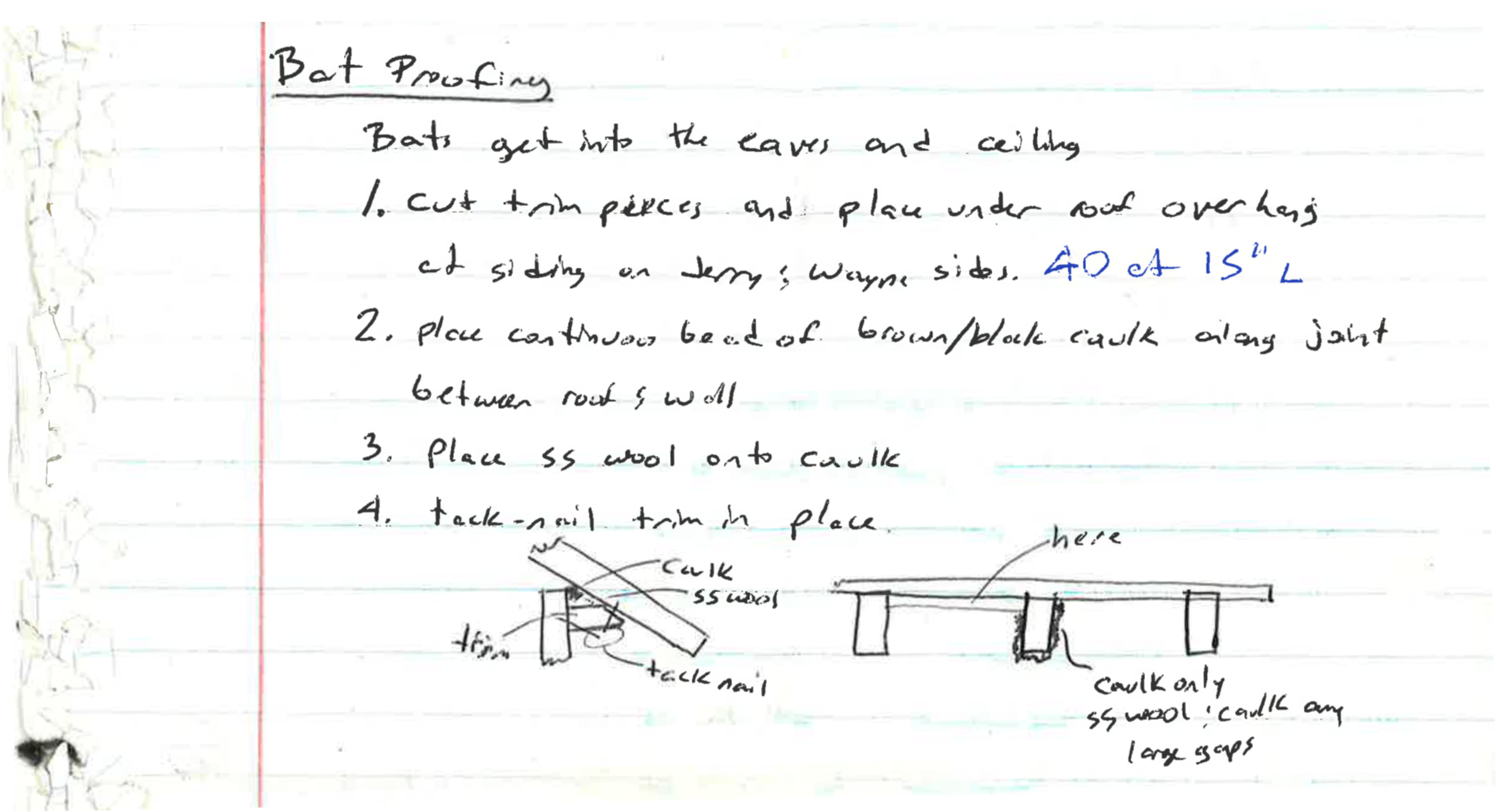 All that I could do now, during the day, was take measurements, develop a design, and start planning. I had learned years ago that mice can’t chew through steel wool. However, steel wool rusts, so I had used stainless steel wool and caulk to fill cracks at Mom’s house in an effort to reduce the mouse infestation. I assumed that bats are not any better chewers than mice.