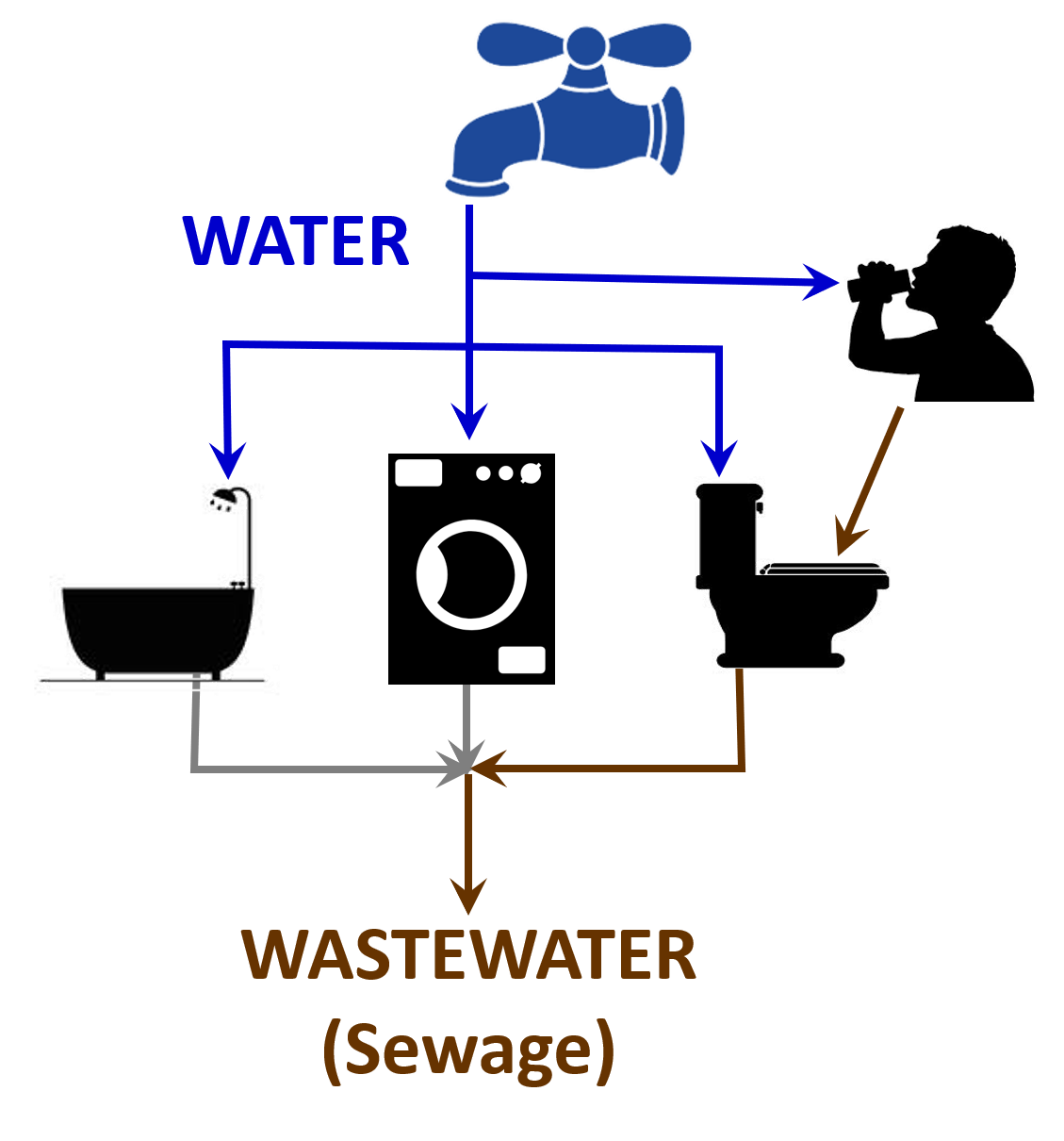 We use that WATER to drink, wash, and flush and almost all of it ends up in our homes’ drain plumbing at which point it becomes WASTEWATER or sewage.