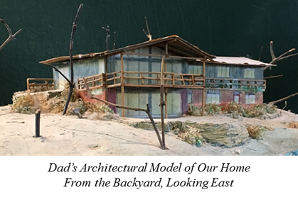 In November of 1963 I was 10 months old and we moved into the “completed” house. I’ve seen the pictures and heard the stories. Dad had built a series of sluices to provide water to the downstairs down-ladder bathroom. There was always a bucket of water next to the toilets for flushing. Not many electrical outlets, but lots of two-pronged extension cords. I learned to walk on plywood, and a year after we moved-in I had a new baby sister, Helen. My older siblings, Bruce and Jan were in high school, Mom stayed home with us young-uns, and Dad worked at the office in Marycrest late into most nights. When he wasn’t at the office he was at meetings for clients sometimes early into the next morning. When he was home he was “finishing the house” which, as-of today is still not quite finished.