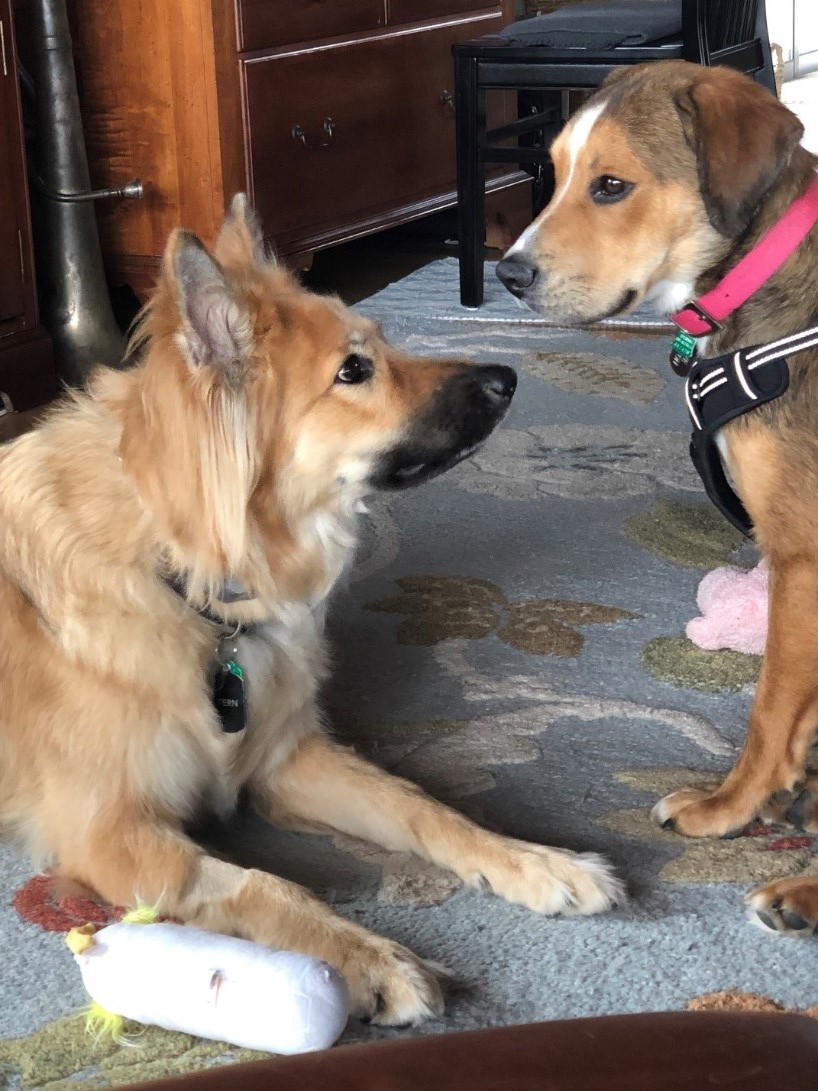 Over the first few days the two dogs seemed to function well when they were together but there was very little interaction. One afternoon, our daughter Aileen sat on the living room floor between the two dogs – both wanted to nuzzle her as she is the doggy-favorite. She picked-up a squeaky toy to see if Olive would play with it – no interest. Then she gave it to Fern. Olive snarled and lunged at Fern biting her on the nose (she still has the scar). Fern retaliated by chomping onto Olive’s neck and refusing to let go. It took both Aileen and Kristen to separate them. Fern was banished to her crate. Olive got a trip to the vet and $150 worth of stitches.